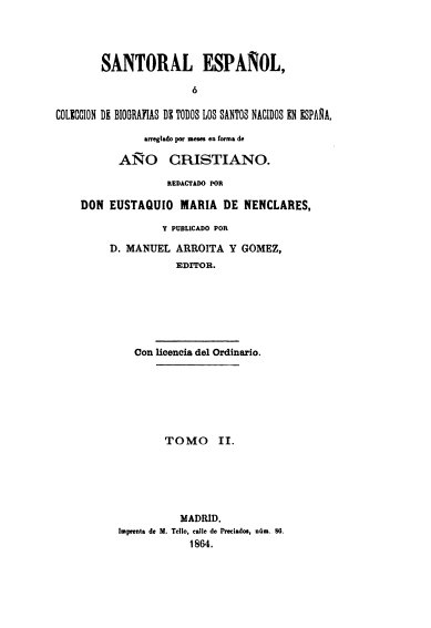 Gracias, como tantas veces, a la ayuda de mi amigo Juan de la Plaza, descubrí la existencia del Santoral español o Colección de biografías de todos los santos de España, publicado en Madrid por Manuel Arroita y Gómez con textos de Eustaquio María de Nenclares e ilustraciones de Pedro Barcala. Se trata, como explica su título, de una hagiografía de santos españoles entre los cuales se cuentan, como cabía suponer, varios estrechamente vinculados a Alcalá. El libro, por cierto, está fechado en 1864 e impreso en la imprenta de M. Tello, en el número 86 de la madrileña calle de Preciados. La edición que he manejado procede de la versión digitalizada por Google, mientras los grabados fueron realizados -en aquella época las planchas de las ilustraciones se hacían por separado de la composición de los textos- por la litografía de Escarpino.