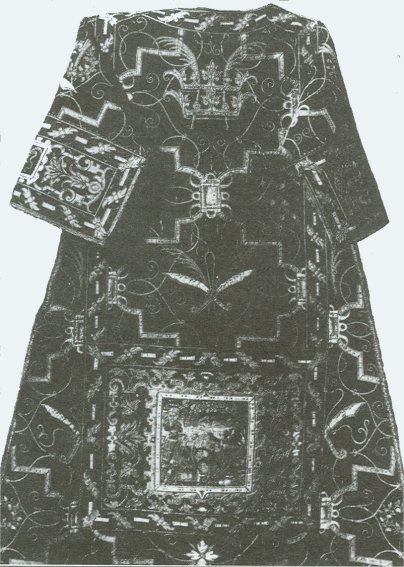 Dentro del ingente patrimonio acumulado en la Magistral a lo largo de los siglos, patrimonio que se perdió en su mayor parte a raíz de los avatares de la guerra civil, las vestiduras eclesiásticas ocupaban un lugar importante, y de entre todas ellas sobresalía un terno (conjunto de casulla, dalmáticas, capa pluvial y resto de ornamentos litúrgicos) adornado con motivos alusivos a la vida y martirio de los Santos Niños. Desgraciadamente este terno ha desaparecido, por lo que tan sólo nos queda el recuerdo de una descripción de los años veinte y un puñado de fotografías del archivo Moreno, esa espléndida colección fotográfica que merecería estar completa al alcance de todos los alcalaínos. La descripción procede del tomo XXXIV del Boletín de la Sociedad Española de Excursiones, correspondiente al año 1926, y forma parte de un reportaje publicado en la citada revista en el cual se describía la exposición de arte religioso que fue organizada en dicha fecha en el palacio arzobispal. La cita es la siguiente: