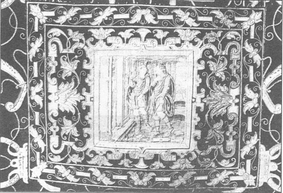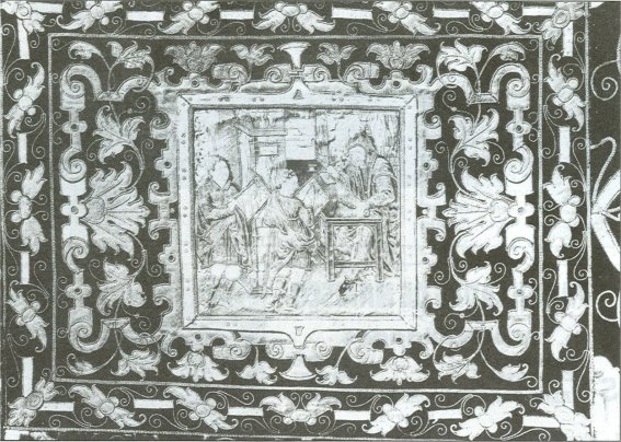 El más considerable núcleo de la Exposición, por su número, belleza y calidad, lo constituyen los ornamentos, muchos procedentes de la Santa Iglesia Magistral, y de su importancia puede dar idea la primera capa pluvial que reproducimos: es de terciopelo carmesí, bordada, de sobrepuestos y presillas con atributos referentes al martirio de los santos niños Justo y Pastor, con dos pares de broches de plata. El embozo tiene bordados seis Apóstoles y en el capillo las imágenes de los santos niños con la palma del martirio. Corresponde a un terno Renacimiento del siglo XVI, al que acompaña un frontal de la misma tela con iguales atributos, y en su centro un medallón con los santos niños. La parte superior y los laterales del frontal tienen sobrepuestas ricas bordaduras; cinco medallones de imágenes y cuatro recuadros con cariátides de estilo pompeyano.