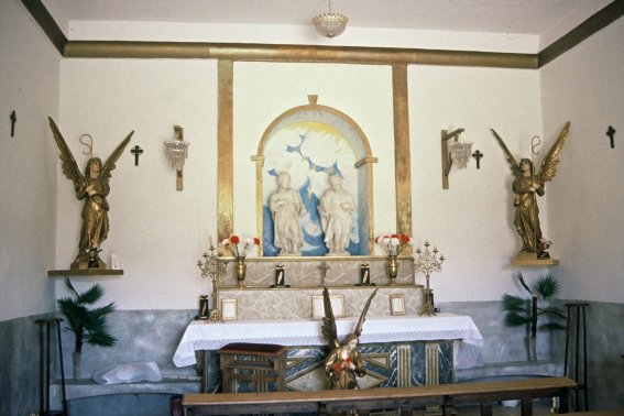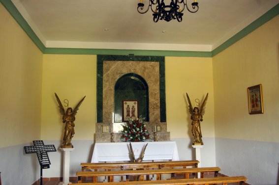 El interior, por el contrario, no parece haber variado demasiado en todos estos años, salvo que la hornacina que oficia de presbiterio fue forrada con mármol beige y verde, aparte claro está de la pintura de las paredes.