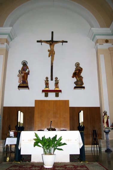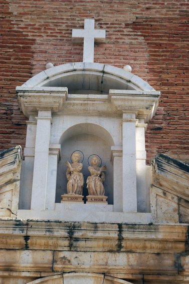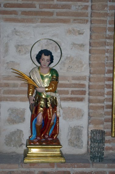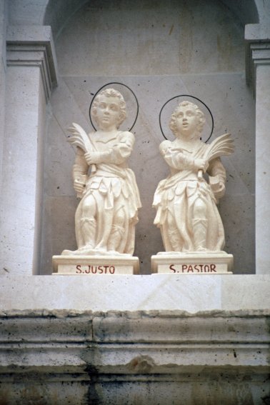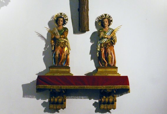 Centrémonos en las imágenes. Éstas están datadas en la primera mitad del siglo XVIII -fueron bendecidas en 1731-, siendo prácticamente contemporáneas a la parroquia actual, por lo que cabe pensar que fueran encargadas pensando ya en ésta pese a que las obras de la misma todavía no estaban terminadas. Se trata de dos imágenes barrocas que reflejan la iconografía clásica de los mártires, dos niños ataviados a la romana -no con toga o túnica, sino con atavíos militares- portando las palmas del martirio y las tablillas escolares, en recuerdo de las circunstancias de su martirio. Lamentablemente, carezco de datos acerca de su autor.