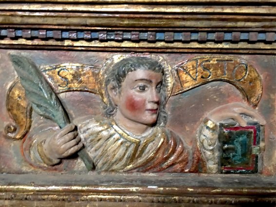 La predela, a su vez, está dividida en tres partes. El motivo central está adornado con el relieve de un ángel, mientras en los dos laterales, que sobresalen ligeramente a modo de capiteles, es donde aparecen los bustos de los Santos Niños, san Justo a la izquierda y san Pastor a la derecha. Ambos sostienen en una mano la palma del martirio y en la otra el libro escolar, mientras sendas filacterias con sus nombres despejan cualquier atisbo de duda acerca de su identidad, que queda así reflejada de forma explícita.