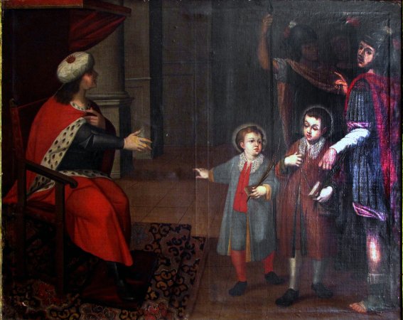 El primer cuadro se conserva en la iglesia de Nuestra Señora de las Nieves de Bogotá. Es un óleo sobre tela y representa el momento en el que los Santos Niños comparecen ante Daciano en el interior de su palacio. Tal como era habitual en esta época, abundan en él los anacronismos: Daciano aparece ataviado con unos ropajes que más recuerdan a un gobernante turco que a un prefecto romano, mientras los Santos Niños visten camisa y calzón y unas largas levitas que sólo con mucha imaginación se pueden asimilar a las túnicas romanas. En sus manos portan sendos libros -un anacronismo más, aunque éste más habitual- y sobre sus hombros reposan las palmas del martirio. Los dos hermanos se muestran relajados, con Pástor escuchado con atención a Daciano y Justo mirándole a él. La escena se completa con dos soldados -lo único realmente romano del cuadro- en actitud vigilante.