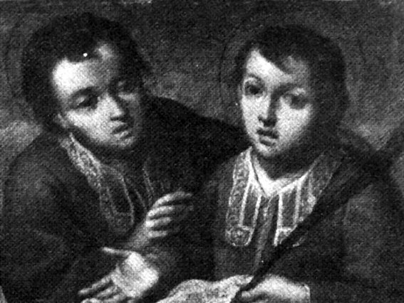 El tercer cuadro es un óleo sobre tabla de propiedad particular, y al igual que en el caso anterior la única fotografía que he conseguido encontrar también es en blanco y negro. En esta ocasión el pintor tan sólo representó los bustos de los Santos Niños, con uno de ellos -presumiblemente Justo, aunque no se aprecia la diferencia de edad- dirigiéndose a su hermano mientras éste mantiene la mirada perdida, como resignándose a su destino. Sólo se aprecia una palma de martirio y, dado que los bustos ocupan la práctica totalidad de la superficie del cuadro, no se aprecian más detalles.