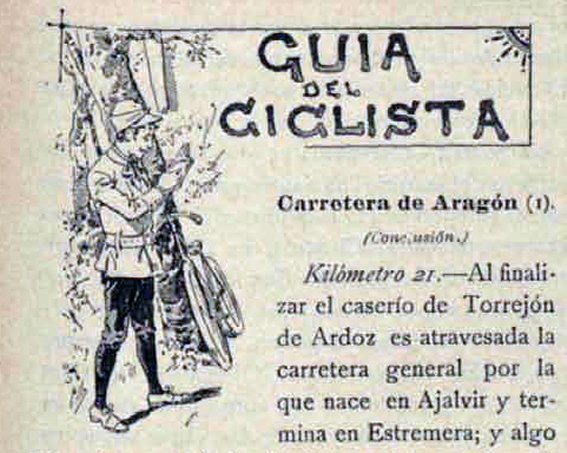 En esta ocasión voy a centrar mi atención en el primero de ellos, que forma parte de una serie en la cual, bajo el título genérico de Guía del ciclista, se describen minuciosamente las principales carreteras que partían de Madrid, coincidentes por lo general con las actuales autovías radiales. El dedicado a la carretera de Aragón, firmado por A.S. -supongo que las iniciales corresponderán al director literario Antonio Sendras-, fue publicado en dos entregas en los números 2 y 3 de la revista abarcando el recorrido existente entre la capital y el límite provincial en la Venta de Meco. Aunque la reseña correspondiente a Alcalá pertenece a la segunda de ellas, nos encontramos con un breve comentario en la primera que resulta interesante recordar: