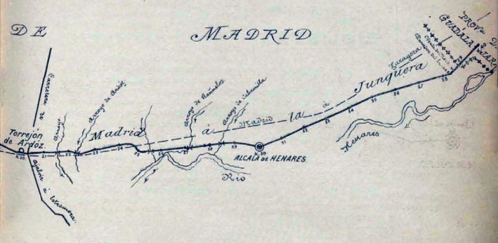 Kilómetro 27.- No ofrece particularidad alguna notable. Descúbrese, y aun antes, al extremo de una línea casi recta de más de cuatro kilómetros de longitud, la ciudad de Alcalá de Henares.