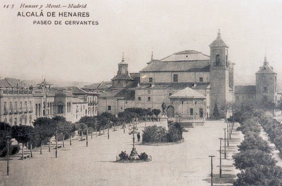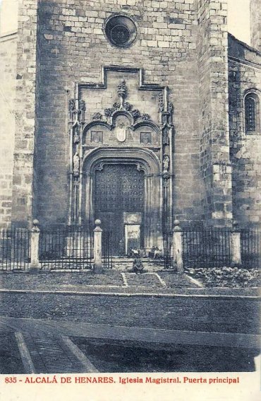 La iglesia de Santa María a la que hace alusión Cossío no es evidentemente la actual, la antigua capilla del Colegio Máximo de los Jesuitas, sino la que se alzaba en el extremo sur de la plaza de Cervantes y de la cual, destruida en la Guerra Civil, tan sólo quedan en pie la Capilla del Oidor, el ábside y la torre. De escaso valor artístico -el templo había quedado inacabado y con unas dimensiones muy inferiores a las proyectadas originalmente-, su principal y prácticamente único reclamo era la pila bautismal de Cervantes, que en la época de la visita -fue trasladada en 1905 a la recién restaurada Capilla del Oidor- se encontraba arrinconada bajo la torre.