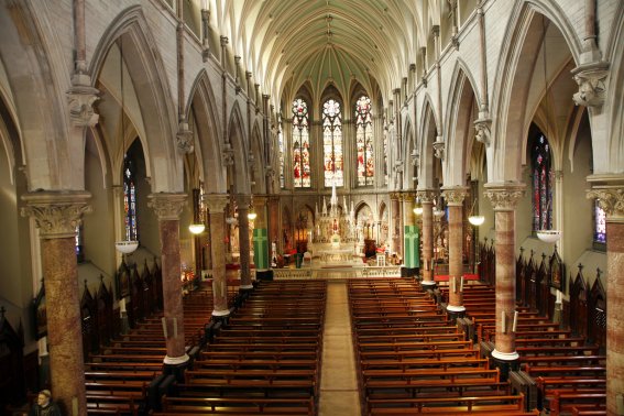 La iglesia, construida en un airoso estilo neogótico que recuerda poderosamente a las catedrales francesas del siglo XIII, es de considerables proporciones: 50 metros de longitud, 28 de anchura y 20 de altura. La torre, que rebasa los 60 metros, es la más alta de Dublín, y está adornada con doce estatuas talladas por el escultor James Pearse (1839-1900).