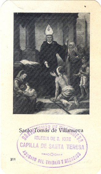 Hace unas semanas, husmeando por el Rastro madrileño, encontré una estampa dedicada a santo Tomás de Villanueva. Ésta, en principio, no tenía mucho de particular; impresa en blanco y negro con una calidad discreta, parecía ser de los años 50 ó 60, antes de que se generalizara el color. En el anverso reproducía un grabado muy parecido -aunque no idéntico- al famoso cuadro de Murillo que se conserva en el Museo de Bellas Artes de Sevilla, junto con el nombre del santo al pie del dibujo, y en el reverso se leía una oración a este santo. El pie de imprenta -sin fecha- indicaba que la estampa había sido editada por la Librería Religiosa Hernández, sita en el número 6 de la madrileña calle de la Paz, y un número -concretamente en 311- situado en la esquina inferior izquierda del anverso parecía indicar su ordinal correspondiente dentro de una previsible serie de estampas religiosas dedicadas a diferentes santos.