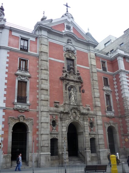 Aunque nada indicaba que esa iglesia de San José fuera la parroquia madrileña de este nombre, en principio parecía probable que lo fuera... así pues, realicé una visita a la misma. Esta parroquia, situada en la esquina de la calle de Alcalá y la Gran Vía, fue originalmente la capilla del convento de carmelitas descalzos de San Hermenegildo, construido a finales del siglo XVI y terminado en 1605. El templo actual, que es lo único que se conserva del desaparecido cenobio, demolido tras la desamortización de Mendizábal -en su solar se alzó el mítico teatro Apolo, reemplazado a su vez por la sede del Banco de Vizcaya-, es obra de Pedro de Ribera, que inició su construcción en 1730 concluyéndose ésta en 1748.