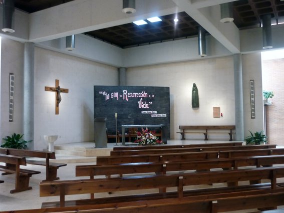 El templo, que en el exterior tan sólo se singulariza por una cruz metálica y por el nombre de la parroquia inscrito en el muro, en su interior es asimismo muy sencillo y sin apenas concesiones estéticas, con muros de ladrillo visto y columnas de hormigón desnudo. Tras la mesa del altar un liso muro de pizarra ocupa el lugar del inexistente retablo ocultando la esquina trasera del recinto, que oficia de sacristía.