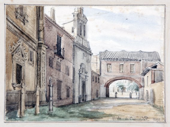 Puesto que dicen que una imagen vale más que mil palabras, en lugar de describirlo prefiero invitarles a que lo contemplen con detenimiento, porque realmente merece la pena. El Arco de la Universidad, demolido pocos años después de realizado el dibujo por el nefasto conde de Quinto, fue uno de los diversos expolios perpetrados por este aristócrata tras hacerse con la propiedad de los edificios más emblemáticos de la extinta Universidad, incluyendo el propio Colegio Mayor, lo que como es sabido acabaría provocando la loable reacción de la Sociedad de Condueños. Pero ésta es ya otra historia.