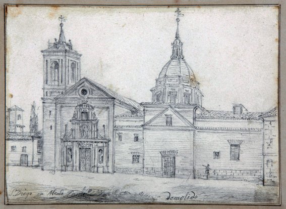 A su derecha se alzaba la capilla de San Diego, aneja a la iglesia y comunicada con ésta, pero en la práctica un edificio independiente levantado sobre el lugar que ocupara la portería en la que trabajó el humilde lego. Según las descripciones con que contamos era un templo suntuoso ricamente decorado, aunque lo único que podemos apreciar en el dibujo es su planta en forma de cruz latina con los brazos transversales cortos, típica del barroco, sobre cuyo crucero se alzaba una airosa cúpula que, unida a la cercana torre de la iglesia, debían de contribuir notoriamente al perfil inconfundible de Alcalá tan alabado por numerosos viajeros y hoy, por desgracia, en buena parte perdido. Aunque al iniciarse la demolición del convento hubo un intento de salvar la capilla, finalmente ésta sería sacrificada a cambio de la preservación de la iglesia de Jesuitas, que también llegó a estar amenazada de derribo.