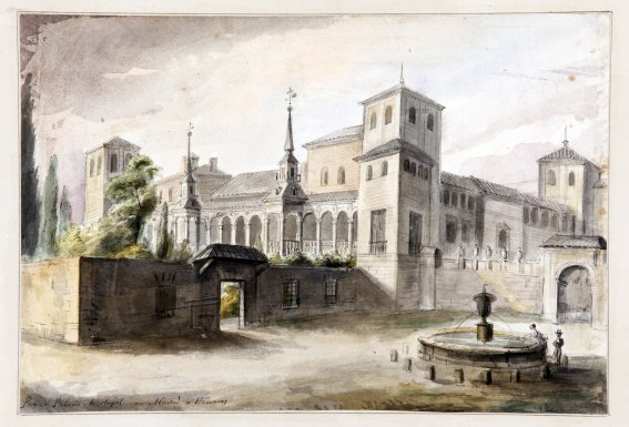 La galería que se ve en primer plano, rematada por dos pequeños chapiteles, se conocía como el patio del Ave María, y daba paso al jardín del Vicario. Todo ello es hoy la explanada del aparcamiento del Pico del Obispo. A la derecha del dibujo aparecen la puerta de acceso y parte de la tapia del patio de armas, también desaparecidos aunque en esta ocasión no por el incendio de 1939, sino a consecuencia de la radical restauración a la que fue sometido el edificio tras ser elegido en 1859 como sede del Archivo General Central. Al parecer para los responsables de la obra resultaban ser poco renacentistas, por lo que no dudaron en sustituirlas por la actual rejería.