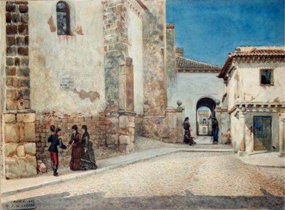 Por fortuna contamos con sus fotografías, lo que nos permite al menos disfrutar del pincel de Laredo así como incrementar, siquiera levemente, el conocimiento gráfico de la Alcalá de la segunda mitad del siglo XIX, no por reciente relativamente poco conocida. Así pues, comencemos por la primera de ellas.