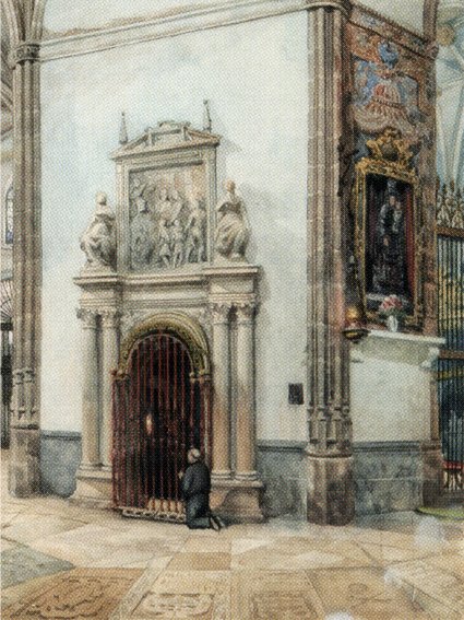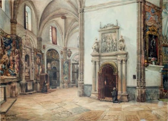 La segunda acuarela reproduce un motivo muy próximo al anterior pero en el interior de la Magistral, ya que corresponde a una vista parcial de la girola por el lado del Evangelio. Aunque la curva de la girola nos impide ver la parte opuesta, el cuadro aporta bastantes elementos de interés hoy desaparecidos y conocidos tan sólo -y no siempre- por antiguas fotografías en blanco y negro, ya que tanto la discutible restauración ejecutada por Luis María Cabello Lapiedra entre 1904 y 1931, como el incendio y saqueo que sufrió en julio de 1936, al que se sumó un abandono total durante la Guerra Civil, acabaron con la mayor parte de sus tesoros artísticos y arquitectónicos, que no eran pocos. Así, Cabello Lapiedra arrasó la práctica de las capillas que se abrían en la girola y en la nave del Evangelio respetando tan sólo las del lado de la Epístola, mientras los graves daños de 1936 afectaron a la práctica totalidad del templo.
