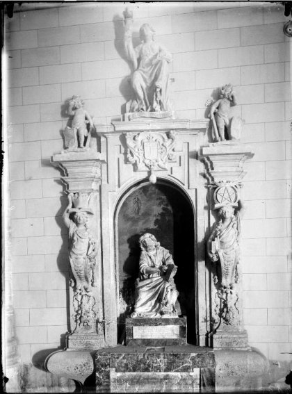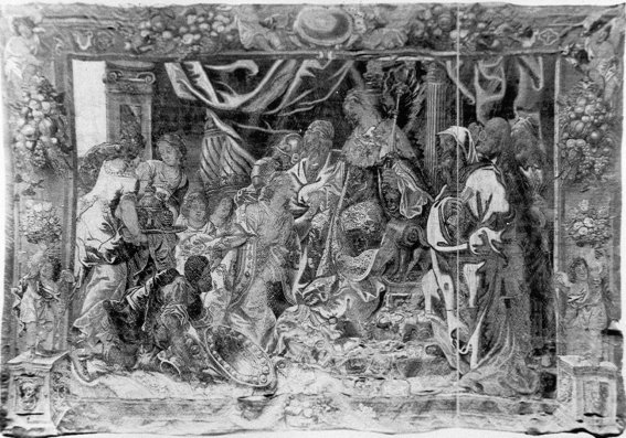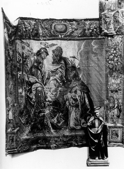 No ocurre lo mismo, por desgracia, otros muchos elementos del cuadro. De izquierda a derecha aparece en primer término un tapiz -aparentemente el de Salomón y la Reina de Saba- y más allá, intercalados entre las capillas, otros dos más de difícil identificación. El más cercano parece ser la Aparición de Dios a Salomón, mientras el tercero pertenecía probablemente a una serie de paisajes que, junto con la de la vida de Salomón y otra de temática mitológica e histórica, constituían la veintena -según algunos autores podrían haber sido más- de tapices con que contaba la Magistral hasta 1936, de los cuales no se conserva ni uno solo. Tan sólo disponemos de la fotografía de uno de los tapices paisajísticos, que no parece corresponderse con el pintado por Laredo.