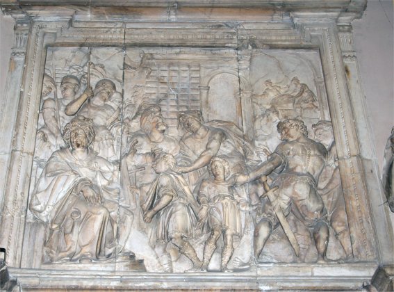 Veamos en detalle lo que quedó reflejado por el pincel de Laredo comparándolo con la situación actual, comenzando con la puerta de acceso a la cripta. Ésta no sufrió demasiados destrozos, e incluso el relieve que la corona, que representa a los Santos Niños frente al pretor Daciano, se conserva en bastante buen estado a diferencia de su compañero, el de la degollación, situado en la puerta opuesta.