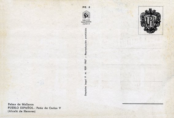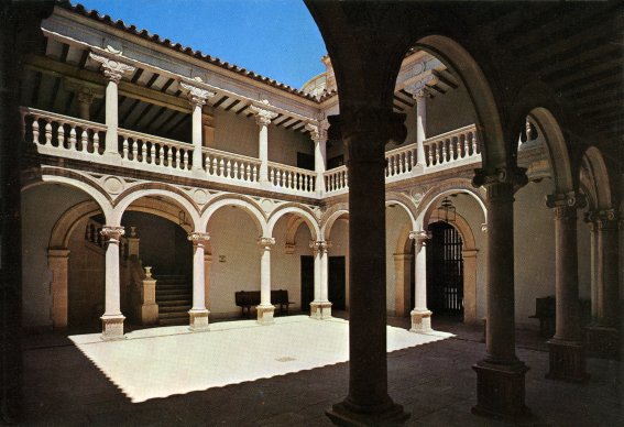 Hace unos meses compré en internet una postal de este patio, oficialmente bautizado como Patio de Carlos V ya que fue durante su reinado cuando se construyó el del Palacio Arzobispal, aunque nada tuvo que ver este monarca con él puesto que fue encargado a Covarrubias por el arzobispo toledano Alonso de Fonseca y terminado durante el gobierno de su sucesor, el cardenal Juan Pardo de Tavera. Eso sí, aunque en la postal aparece con esta incorrecta denominación, acto seguido figura Alcalá como lugar de ubicación del monumento original, sin advertir que el patio no existe ya.