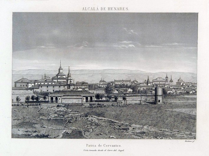 El grabado de Alcalá aparece firmado por Martínez; aunque aventura el autor de la ficha1 que lo acompaña que pudiera tratarse de José Martínez de Castro, este grabador estuvo activo, según datos recogidos de la Calcografía Nacional, entre 1795 y 1819, lo que hace imposible que pudiera tratarse del mismo. En la parte superior del dibujo aparece escrito el nombre de la ciudad, mientras en la inferior se lee Patria de Cervantes. Vista tomada desde el Cerro del Ángel.