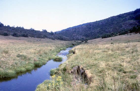 Aquí es donde ha de tener lugar, en sentido estricto, el inicio de la etapa. Abandonando su vehículo el viajero comenzará a remontar a pie el curso del río adentrándose, por su ribera derecha, en el abrigado valle del mismo. No mucho más adelante, merced a la sinuosidad del mismo, perderá la visión de lo que se podría calificar como su campamento base, encontrándose sumergido por completo en un paisaje que en modo alguno le habrá de resultar desagradable: El valle, pequeñito pero gentil, es abierto a la par que angosto, lo que permite al viajero remontarlo con toda comodidad ora por la ribera del río, ora por una cota más elevada en función de la cambiante orografía del terreno. Los taludes del mismo, aunque descienden hasta el mismo lecho del Sorbe, no son ni demasiado altos ni demasiado empinados, con árboles en su parte superior -todavía no son hayas- y una tupida pradera en su tramo más cercano al río, hierba ésta agostada por los rigores del estío pero presumiblemente fresca y lozana en otras épocas del año de más favorable climatología. En lo que respecta al río, que es a la postre el verdadero protagonista, éste discurre con calma pero con brío, que para eso es serrano, serpenteando juguetón por el fondo de su pequeño valle y acercándose ya a uno de los taludes ya al opuesto, pero siempre permitiendo que los mismos desarrollen unas amplias riberas que son una suerte para un viajero preocupado no por la longitud de su camino, pero sí por lo practicable del mismo.