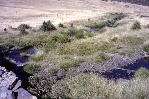 Pero el estiaje es, a pesar de todo, muy fuerte, como indica el lecho patéticamente seco de uno de los numerosos barrancos que se cruzan en su camino... Lecho no obstante tapizado de cantos de pizarra que muestran, en gris contraste con la parda vecindad de la hierba agostada, cómo en tiempos mejores por allí desciende agua. Por lo demás, sólo en un par de ocasiones se encontrará el viajero con dificultades a la hora de continuar con su camino debido a la conjunción del acercamiento del Sorbe a una ribera derecha repentinamente más escarpada con la aparición de manantiales que, si bien no impiden demasiado el tránsito, sí que lo hacen momentáneamente más dificultoso.