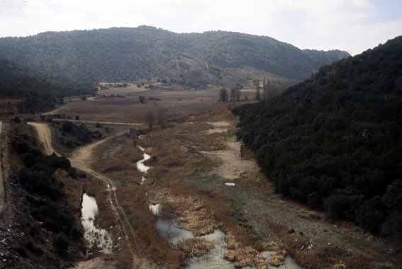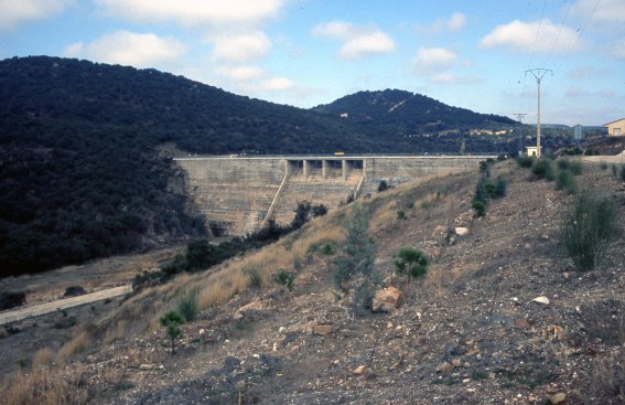 La carretera de la derecha imita al Salado en su grácil curva, salvándolo por un funcional puente vecina del cual se atisba una estación de aforo. Remonta a continuación el valle aguas arriba aunque, eso sí, sin arrimarse demasiado al mancillado río, en un alejamiento indudablemente casual pero que al viajero le gusta imaginar como una imposible muestra de respeto. Tras un recorrido de quizá unos dos kilómetros se atisba finalmente, camuflada en un recodo del valle, la controvertida presa.