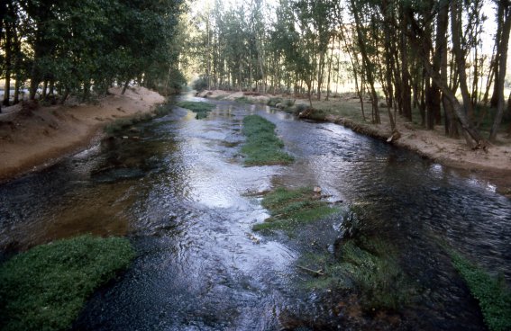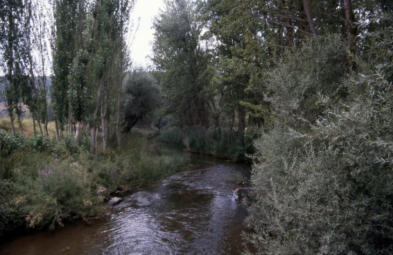 Si el viajero opta por recorrer esta ruta deberá pues abandonar Jadraque, tal y como quedó dicho, tomando la carretera que conduce a Atienza para, a poco de la salida, encontrarse con la rotonda de la que arranca la flamante carretera que, tras salvar el curso del Henares, desciende por su valle hasta alcanzar la localidad de Humanes. Dejada atrás esta nueva ruta, que será objeto de una etapa propia, el viajero sigue adelante hasta encontrarse con el cauce de un Henares aún empequeñecido, pero ya bravo y bullidor, que se interpone en su camino al tiempo que le ofrece la umbría soledad de sus frondosas riberas a modo de un oasis de verdor situado en mitad de la árida llanura. Inmediatamente después de cruzar el río y la contigua vía del ferrocarril, una desviación que conduce a Castilblanco de Henares le concederá la opción de acercarse hasta las orillas del cercano Cañamares, el modesto afluente del Henares que vive aquí sus horas postreras arropado por una fresca y agradable chopera que acaba confundiéndose poco más allá con la que orla generosamente las márgenes del río padre.