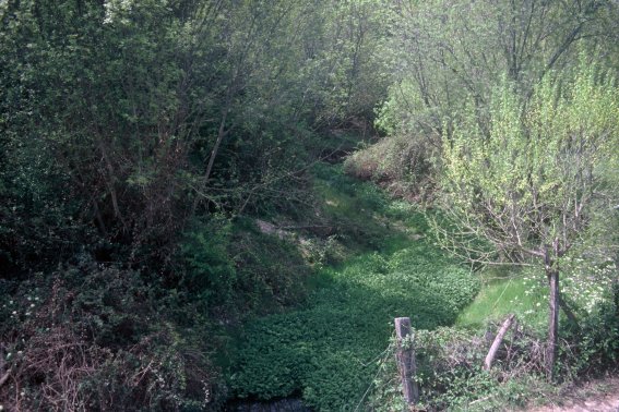Dicen los mapas que el Henares discurre en este lugar tras la doble vía del ferrocarril, ocultándose pudorosamente tras el verdor que festonea sus riberas. A la izquierda del viajero se atisba el pretil de un puente, y hacia allí se encamina éste aprovechando que el camino, tras cruzar el paso a nivel, se bifurca conduciendo una de sus ramas precisamente a ese lugar. Y, efectivamente, el Henares aparece allí... O mejor dicho su cauce, no sólo estrecho tal como cabría esperar de su juventud, sino también prácticamente seco; un río, en definitiva, al que la falta de respeto del hombre ha reducido a su mínima expresión, reservando la mayor parte del vano del puente para un camino mientras las magras aguas del río se ven constreñidas por un insolente muro de cemento que convierte a su curso en una mínima y, diríase, casi miserable acequia.