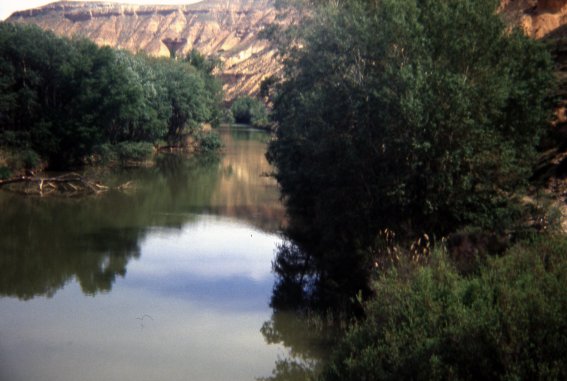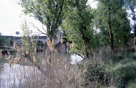 La sorpresa llegará, no obstante, cuando el viajero dirija su mirada hacia el otro lado del puente sobre el que discurre la carretera: lo que a un lado únicamente era un humilde y pedregoso cauce se revelará, aguas arriba, como un anchuroso remanso difícil de imaginar como perteneciente al mismo curso de agua de apenas unas decenas de metros río abajo, mientras que las -probablemente por culpa de la poco escrupulosa acción humana- peladas riberas situadas aguas abajo del puente se mostrarán hacia el otro lado, siquiera en la margen derecha, ya que la izquierda no es sino un abrupto farallón, cubiertas de un fresco y exuberante verdor. Pero la evidencia no puede ser más palpable a pesar, incluso, de la reciente sangría que le ha supuesto al Henares el canal homónimo derivado de la cercana presa, invisible desde aquí al quedar oculta tras el majestuoso recodo descrito por el río a la vera de la maternal muela de Alarilla, la cual, a modo de imponente telón de fondo, oficia aquí de afortunado horizonte para tan interesante vista... Porque el Henares se muestra aquí como un río maduro y reposado, un río que sabe jugar a ser mayor sin que por ello precise abandonar su aspecto travieso y juvenil, su imagen tradicional de fiel compañero que, antes que respeto, infunde confianza al viajero.