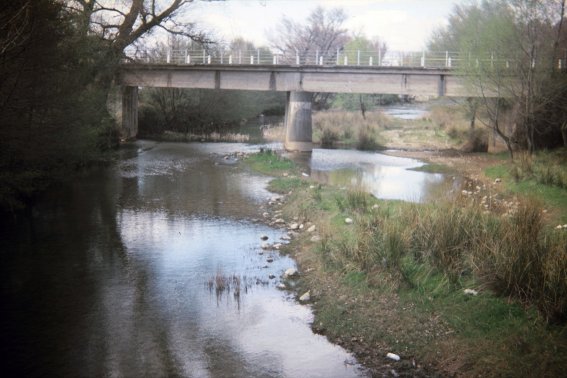Nada mejor que hacerlo desde el propio puente, tan moderno y funcional como la carretera que pasa por él, mas esto tan sólo podrá hacerlo en uno de los dos sentidos, aguas arriba en concreto, ya que sobre el pretil opuesto discurre una inoportuna tubería, posiblemente procedente del cercano embalse de Alcorlo, que dificulta hasta casi impedirla la contemplación de las aguas del Bornova alejándose camino de su cercano encuentro con el Henares. Ciertamente, reflexiona el viajero, saciar la sed de las poblaciones situadas Henares abajo, su propia Alcalá natal entre ellas, ha de tener prioridad sobre actividades como la suya que tan sólo se pueden justificar recurriendo a la literatura; pero pese a ser plenamente consciente de ello, lo cierto es que no dejará de lamentarse por el obstáculo que aquí se interpone a sus deseos.