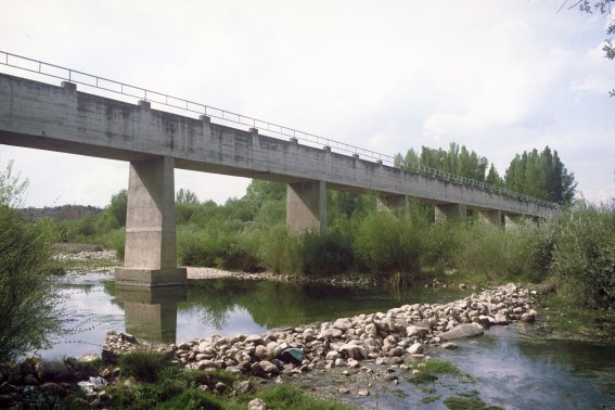 Pero sin duda, lo más espectacular del paraje será el largo acueducto que, con ínfulas de puente, atraviesa de parte a parte la amplia vaguada por la que discurre nuestro río sirviéndose para ello de toda una numerosa teoría de pilares de hormigón que, zancada a zancada, le permitirán salvar este accidente topográfico. No le resultará nada difícil deducir al viajero que la conducción debe de proceder del cercano embalse de Beleña, transportando por ello sus líquidos caudales hasta las ciudades de Alcalá y Guadalajara; cruel paradoja ésta, que permite al expoliador transportar impunemente el producto de su saqueo por encima de su inocente víctima, un río Sorbe que arrastra con pesar sus menguados caudales al tiempo que ve cómo discurren sobre su cabeza las aguas que no mucho atrás le pertenecieran legítimamente. Y como el viajero se beneficia también de esta continua sangría en su condición de complutense, no tendrá por menos que acongojarse ante tan necesario, pero no por ello menos triste, tributo.