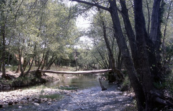 Gracias a un senderillo toscamente labrado en el mismo talud no le será demasiado difícil descender hasta la orilla misma del Sorbe, mientras un rústico, pero eficaz puente, formado por unos tablones clavados sobre un par de troncos tendidos, le permitirá asimismo cruzar el breve curso del río. El paraje, en su pequeñez, se le habrá de antojar necesariamente encantador, con un Sorbe cantarín que discurre bajo sus mismos pies, aislado por completo del exterior merced a la doble barrera que forman los árboles primero y el talud de roja tierra después. Un minúsculo paraíso, en suma, si no fuera por la familia al completo que se ha asentado unos metros más allá, ni por los alevines de urbanitas que, al otro lado del remanso del río, parecen disfrutar galopando en una extraña y ruidosa motocicleta todoterreno.