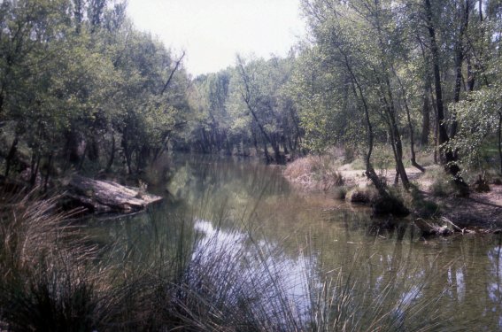 Vuelto de nuevo a su vehículo, el viajero desandará lo andado buscando de nuevo la carretera; pero antes de llegar a ella un sexto sentido -o, más bien, la semivelada visión del curso del Sorbe discurriendo paralelo a su ruta- le moverá a detenerse en un lugar, próximo ya al inicio del embalse que alimenta la toma de agua potable. Allí la vegetación es muy espesa y le impide divisar, prácticamente por completo, al escondido río y, por si fuera poco, la existencia de un pequeño caz que supone una eficaz barrera entre él y el Sorbe; pero deambulando por allí logrará descubrir, apenas unos pasos más atrás, que el lecho del caz se encuentra en ese lugar completamente seco, quizá a consecuencia del escaso caudal arrastrado por el río que lo alimenta. Saltará, pues, el viajero, el inútil obstáculo, llegará a la inmediata ribera del río donde un par de muchachos pescan plácidamente y descenderá algunos metros introduciéndose en la frondosa floresta... Encontrándose al fin en un apacible e impoluto soto en el cual se hermanan la tupida vegetación de ribera con un Sorbe remansado que, jugando a ser mayor, consigue olvidarse, siquiera de forma efímera, de lo menguado de sus fuerzas. Cierto es que en este lugar deben de estar comenzando ya a notarse los efectos del cercano azud, debiéndose a esa prosaica razón, y no a otra, el aparente aumento de los caudales del Sorbe; pero lo artificial de la situación no impide que el paraje sea, sin ningún género de dudas, enormemente atractivo para el viajero, el cual juega no obstante a imaginar cómo sería este gentil río antes de que la presa de Beleña le privara de parte importante de sus caudales.