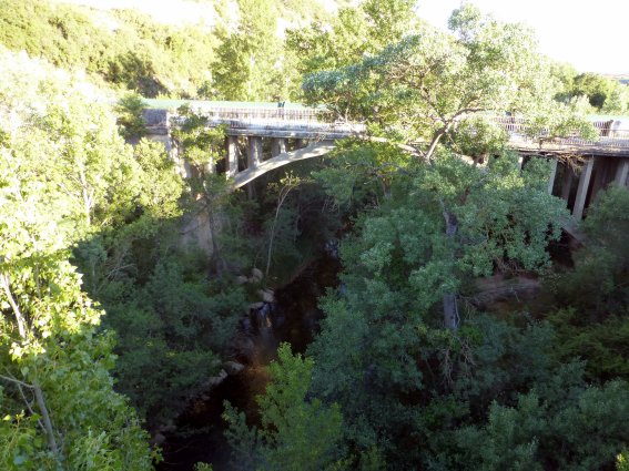 El viajero recordaba, de una anterior estadía por estos parajes, un Sorbe cristalino y profundo, con su hondo y encajonado cauce profusamente cuajado de un verdor umbrío y apacible que hubo de recordarle las nemorosas aventuras de los héroes pastoriles tan famosos durante las pasadas centurias. Sin embargo, ahora tendrá ocasión de comprobar, a modo de desagradable sorpresa, cómo la dentellada del progreso mal entendido ha dejado aquí su indeleble huella en forma de un nuevo y feote puente construido para dar paso a la ensanchada carretera sin el menor respeto para el encanto del lugar, fruto evidente de esa arrogancia bárbara que acostumbran a exhibir las modernas obras de ingeniería. A su lado, inútil y ya arrumbado, aunque todavía entero, se alza su predecesor, fechado en 1920 e infinitamente más integrado en el paisaje, obligado eso sí a pagar el duro peaje de ver cómo uno de sus pretiles era aprovechado pare tender sobre él una gruesa tubería destinada a conducir el agua detraída al Sorbe en el cercano embalse de Beleña.