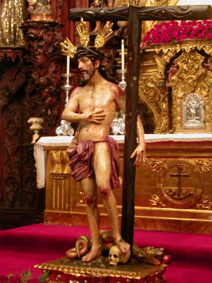 Cristo Varón de Dolores aparece como un Ecce Homo erguido y abrazado a la cruz, con el pie apoyado sobre una calavera simbolizando su triunfo sobre la muerte mientras tras él se enrosca una serpiente, símbolo a su vez de su triunfo sobre el demonio.