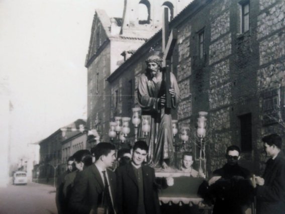 Gracias a don José Moro Vicente, que amablemente me ha cedido esta interesante fotografía, me ha sido posible ampliar los breves datos de que disponía sobre la efímera procesión (tan sólo se mantuvo durante unos tres años) de la imagen de Jesús con la Cruz a Cuestas que, como he comentado en el capítulo anterior, se conservaba entonces en el convento de las Juanas. Esta iniciativa, ajena a las cofradías, fue tomada por varios jóvenes de los que don José Moro, además de él mismo (es el que aparece en el centro de la fotografía), recuerda entre otros a José César Álvarez, Luis Iglesias, Guillermo Calleja o Carlos Chacón, la mayoría aunque no todos alumnos o ex-alumnos del colegio Santo Tomás, lo que le induce a pensar que el promotor de la procesión pudiera haber sido un sacerdote profesor de religión de este colegio.