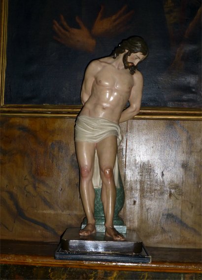 La iconografía de Jesucristo, en lo relativo a las imágenes pasionales, se completa con dos representaciones de Cristo atado a la Columna muy diferentes entre sí. La primera de ellas es una pequeña talla -no tendrá más de un metro de altura- que se conserva en la capilla del Hospital de Antezana. Tan sólo esta fotografía es lo que puedo aportar sobre él, aunque aparentemente la imagen no es reciente.
