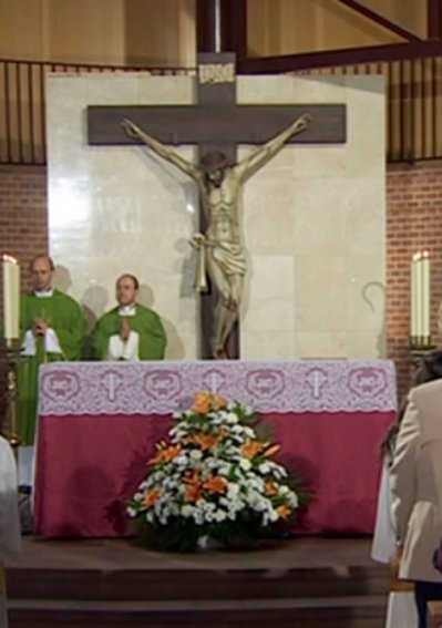 Nos desplazamos ahora hasta la parroquia de Santo Tomás de Villanueva, una de las más recientes de la ciudad, radicada en el barrio de Espartales. Tras estar ubicada durante varios años en unos barracones prefabricados, cuenta hoy con un espléndido templo en cuyo testero fue colocado el crucifijo que ya presidía las instalaciones provisionales. En 2024, a raíz de la decoración del presbiterio con unas pinturas murales del sacerdote y pintor rumano Ioan Gotia, el crucifijo fue trasladado a la capilla aneja.