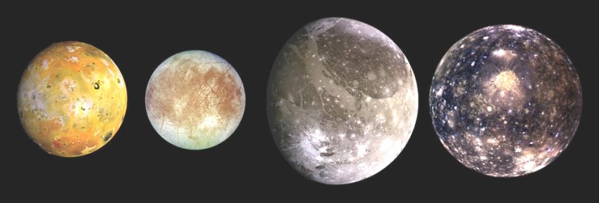 galileanos de Júpiter. De izquierda a derecha: Ío, Europa,