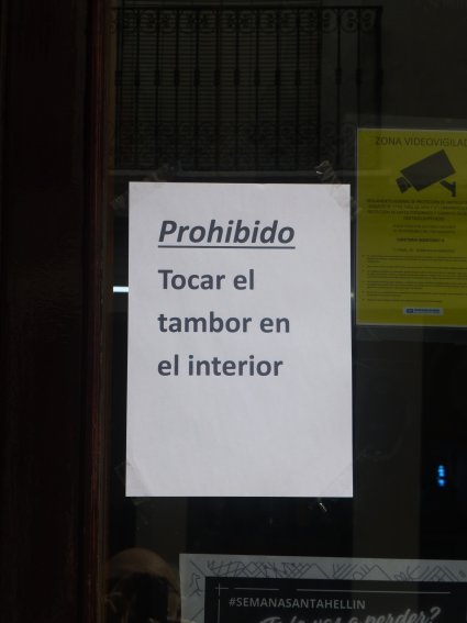En mi escapada de Semana Santa de 2025 hice parada en la localidad albaceteña de Hellín, donde me encontré con este curioso cartel pegado en el escaparate de un bar. Como es sabido la Semana Santa hellinera es famosa por su tamborrada, sin duda interesante siempre y cuando la experiencia para el visitante, al menos en mi caso, no rebase cierto tiempo.