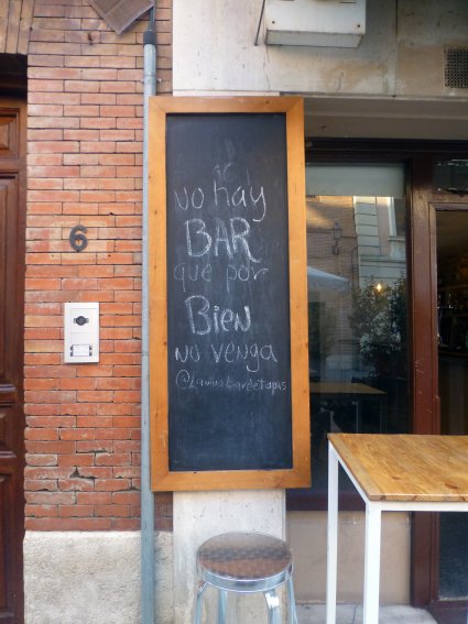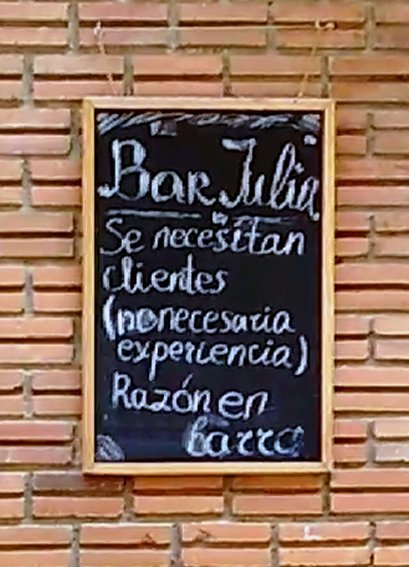 En cualquier caso de su lectura cabe suponer que, al igual que tantos y tantos pequeños empresarios españoles, al dueño de este bar le vendría bien disponer de una mayor clientela; pero lejos de lamentarse, o de echar la culpa -con bastante razón- a los políticos que nos (des)gobiernan, optó por ponerle al mal tiempo buena cara invitándonos con ingenio y simpatía a visitar su bar.