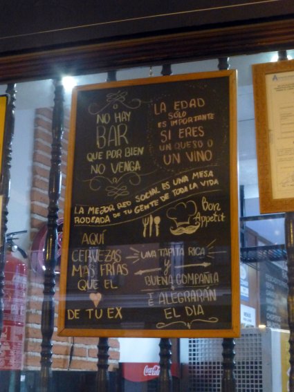 Algo más de un año después, en febrero de 2023, cacé esta pizarra también en un bar de Alcalá de Henares. Su abigarrado texto era toda una declaración de intenciones del propietario de cara a incentivar la entrada de clientes, con varias máximas jocosas tales como No hay bar que por bien no venga, La edad sólo es importante si eres un queso o un vino -mi favorita-, La mejor red social es una mesa rodeada de tu gente de toda la vida, Aquí cervezas más frías que el corazón de tu ex o Una tarta y buena compañía te alegrarán el día. Imposible decir más en tan corto espacio.