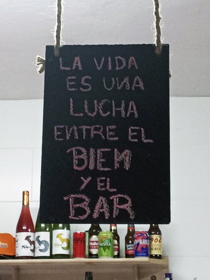 El mismo espíritu humorístico compartía la pizarra que encontré tres meses después, en agosto de 2025, colgando de la barra de un bar en el pueblo en el que acostumbro a recuperarme de la agobiante vida de la ciudad. Aunque el texto es una variante del anterior, el mensaje viene a ser el mismo e igual de divertido.