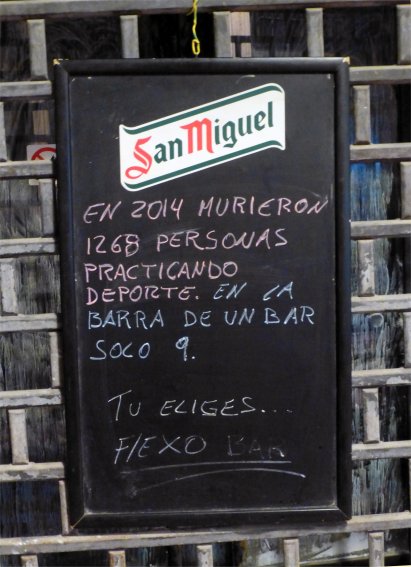 En abril de 2015 tomé esta fotografía en la terraza de un bar de Cartagena y, como se puede comprobar leyendo el texto escrito en la pizarra, la lógica del argumento no puede ser más contundente, sobre todo para aquellos que, como yo, identifican al ejercicio físico con un castigo divino.