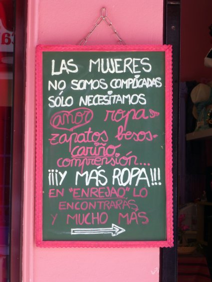 Ahora bien, no todo el mundo debe de pensar igual a juzgar por la pizarra que descubrí, durante la Semana Santa de 2019, colgada en la fachada de una tienda -en esta ocasión no se trataba de un bar- de la localidad gaditana de Chipiona, donde una mano aparentemente femenina a juzgar por ese Las mujeres no somos complicadas negaba rotundamente que lo fueran, dando argumentos fehacientes para explicar la forma en la que los varones podríamos entenderlas con facilidad... eso sí, tirando de cartera.