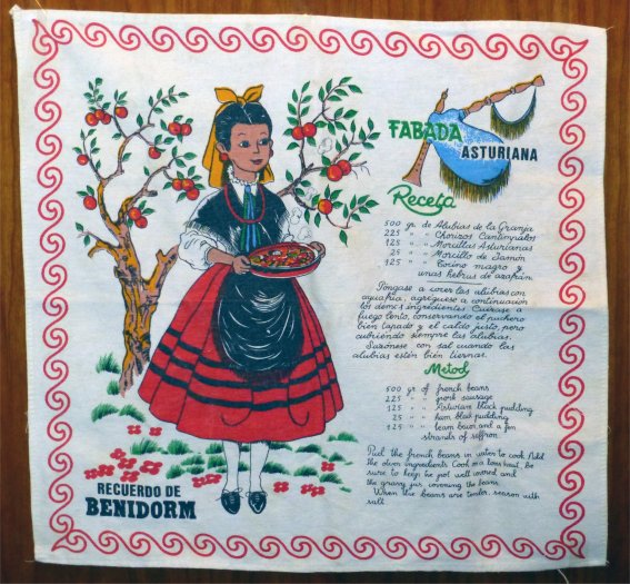 Para empezar, en el paño campea la divisa Recuerdo de Benidorm, lo que aclara nuestras dudas sobre su origen. Y, dada su naturaleza, nada mejor que reproducir algo tan relacionado con ella como es una receta; concretamente, la de la fabada asturiana.