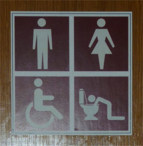 Lo que me llamó la atención, pues, no fue el diseño de los pictogramas en sí, sino la existencia de un cuarto acompañando a los tres tradicionales que sirven para indicar el lugar adecuado para cada uno de los dos sexos, así como, en su caso, también para los inválidos. Este cuarto indicativo, según deduje, pretendía indicar que el inodoro situado tras la puerta podía ser utilizado no sólo para aliviar aguas menores y mayores, sino también para aquellos desagradables casos en los que la comida se empeña en seguir el camino opuesto al que dictamina de forma natural el proceso de la digestión... o al menos eso supuse yo, ya que no tuve necesidad alguna de utilizarlo.