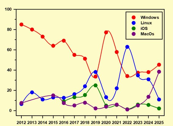 2025, un año atípico a causa del inusitado incremento de visitas, también modificó de forma drástica el equilibrio entre los distintos sistemas operativos. Windows se recobró ligeramente remontando 6,5 puntos, lo que le permitió afianzar su primacía. Sorprendentemente Linux se derrumbó cayendo del 30,9 % de 2024 a 11 %, perdiendo el segundo puesto en beneficio de MacOs o Macintosh, nombre con el que aparecía este año, que remontó del 13,6 % al 38,4 %, dándole literalmente la vuelta a la tortilla. Por último iOS continuaba su caída hasta un un mínimo del 2,1 %.