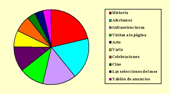 Este grupo cuenta en conjunto con unos 50 artículos, de los que los 28 que aparecen en los listados representan algo más de la mitad; lo que no está nada mal, aunque buena parte de ello se debe a su condición minoritaria, lo que eleva los resultados. Desglosándolos uno por uno comprobamos que sus respectivos porcentajes respecto al total de su correspondiente sección son los siguientes: Historia, 75 %; Aforismos, 100 %; Infraestructuras, 80 %; Visitas a la página, 100 %; Arte, 38 %; Varia, 50 %; Cine, 33 %; Las selecciones del mes, 14 % y Tablón de anuncios, 100 %.